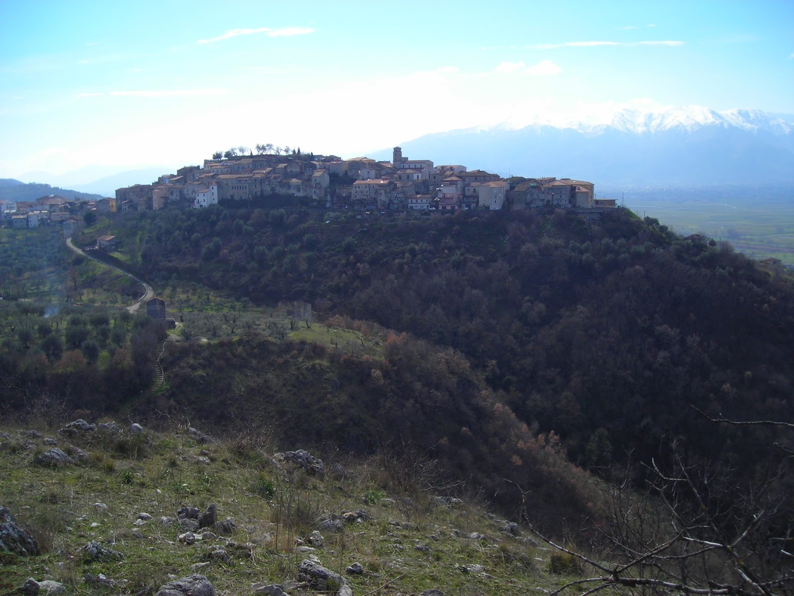 Il versante nord dell'insediamento antico di Atena Lucana, visto dalla Rupe Rossa. Sullo sfondo: il Vallo di Diano.